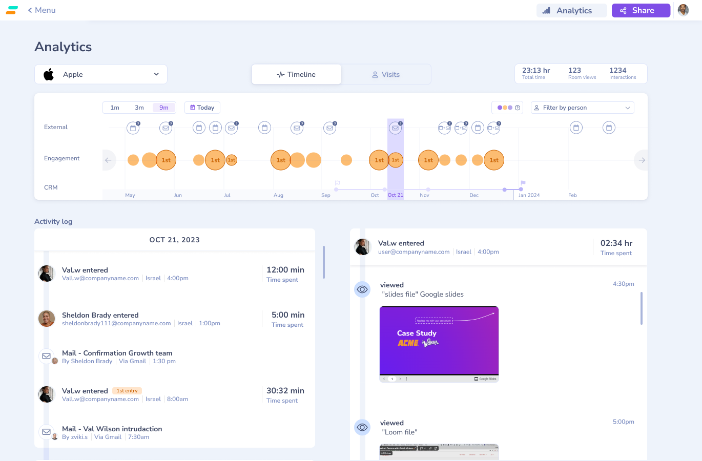 Macro analytics view: a time-based storyline of buyer interactions, letting sellers scan visits over time and then dive into a specific room’s activity when they need more detail.