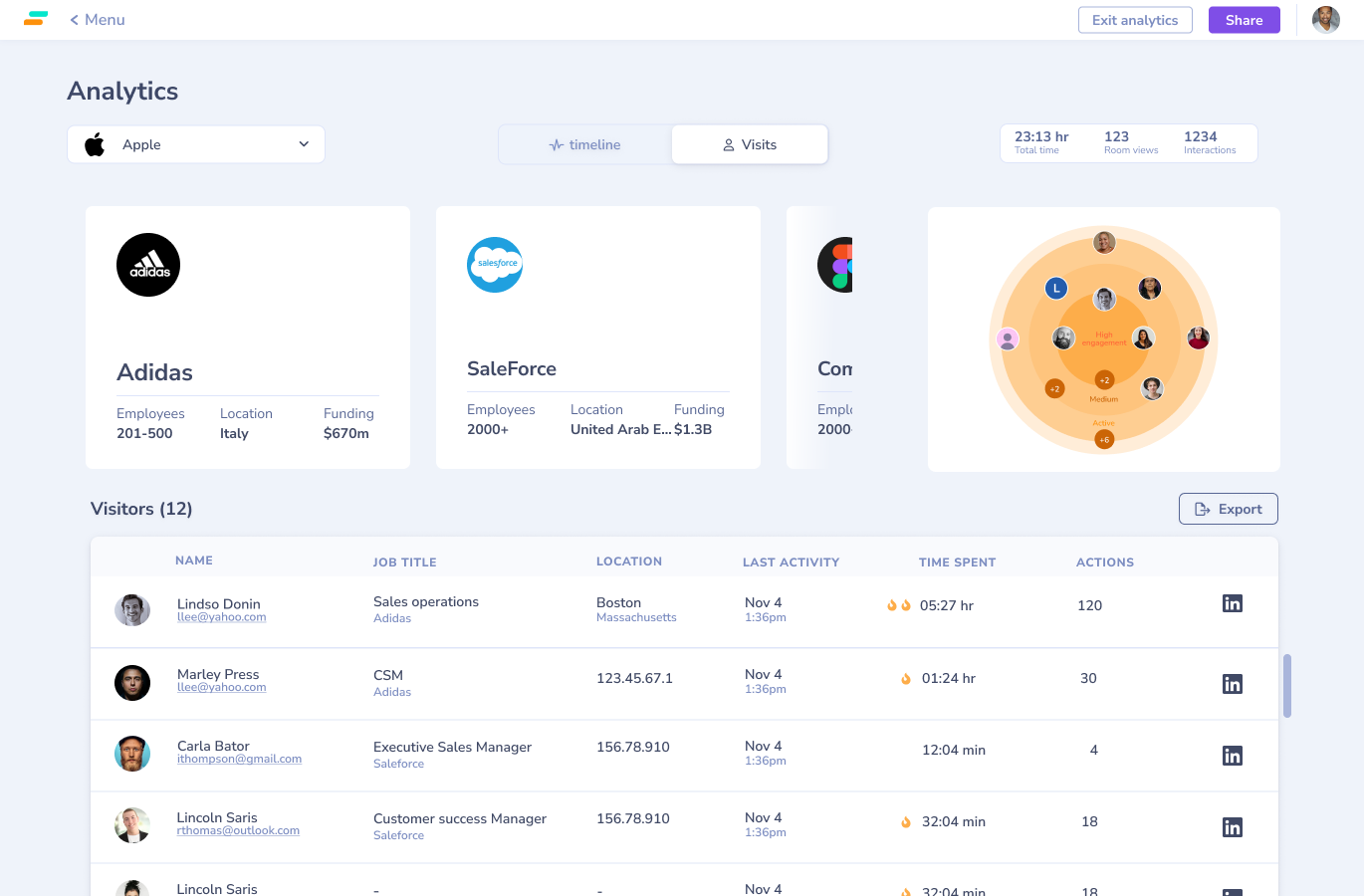 Account and visitor overview: a high-level snapshot of key accounts, room engagement, and individual visitors, giving sellers a starting point before zooming into timelines and detailed interactions.