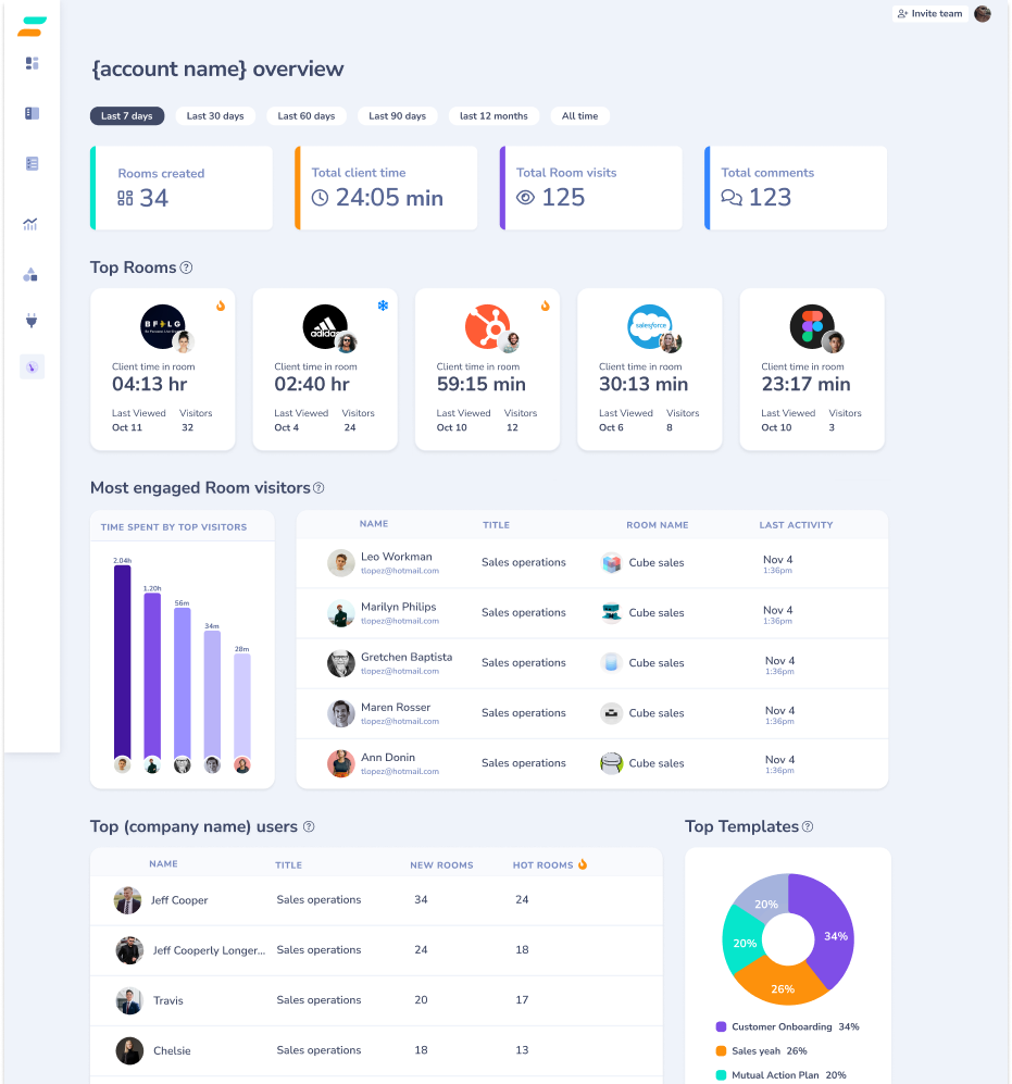 Analytics view for “Top rooms” and visitor activity, showing the rounded cards, soft color palette, and typography system that define Aligned’s friendly, non-corporate look.
