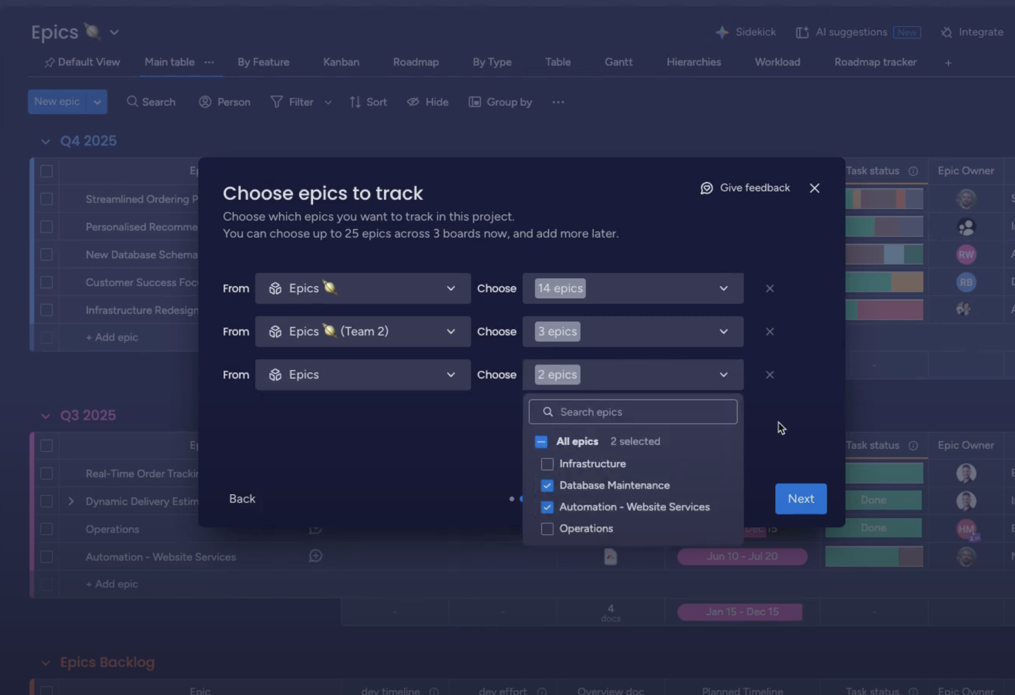 Multi-board epic selection: a focused modal that allows users to pull epics from different boards into one Agile project without overwhelming them.
