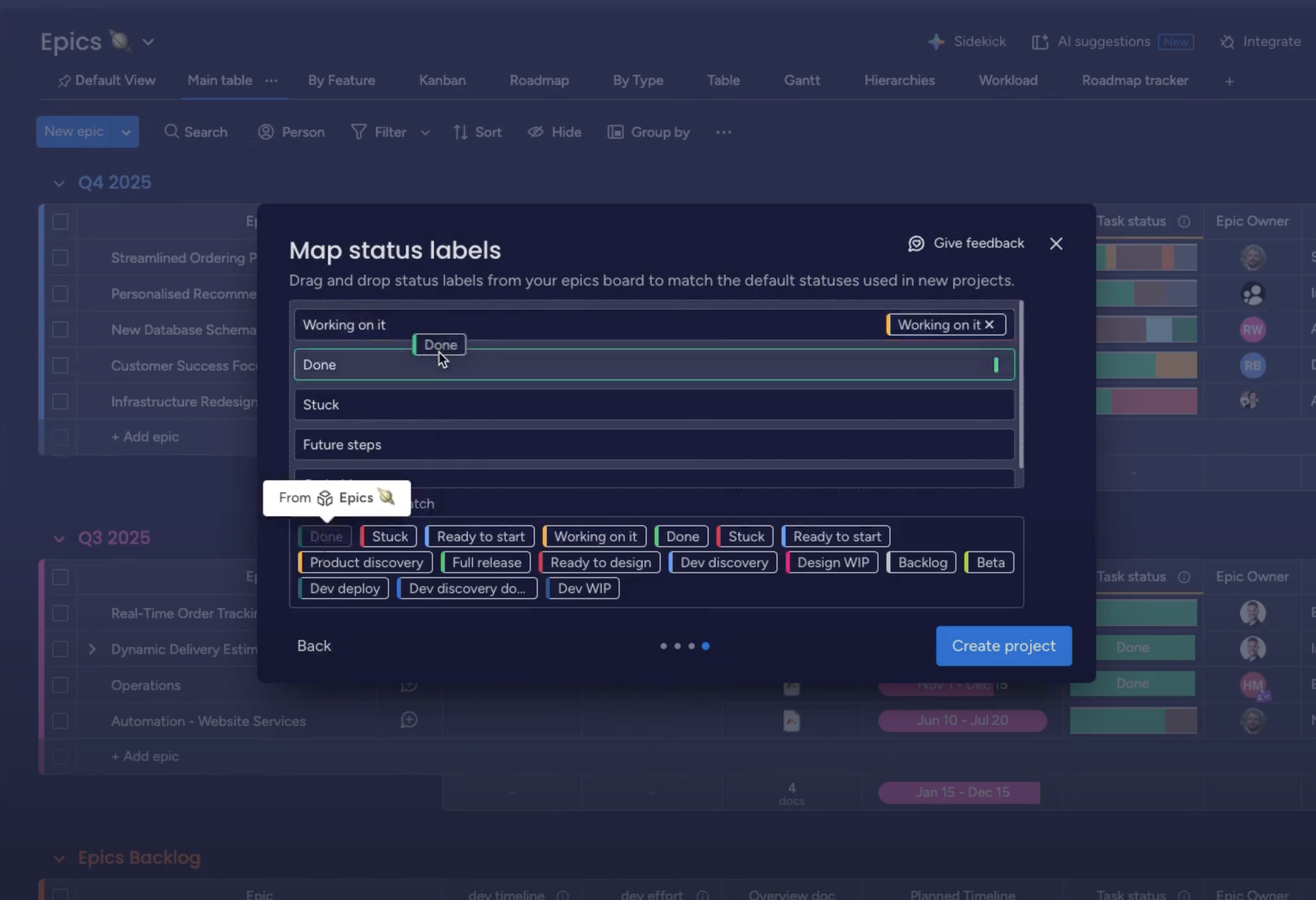Drag-and-drop status mapping: users match labels from their epics board to the default statuses in the portfolio template.